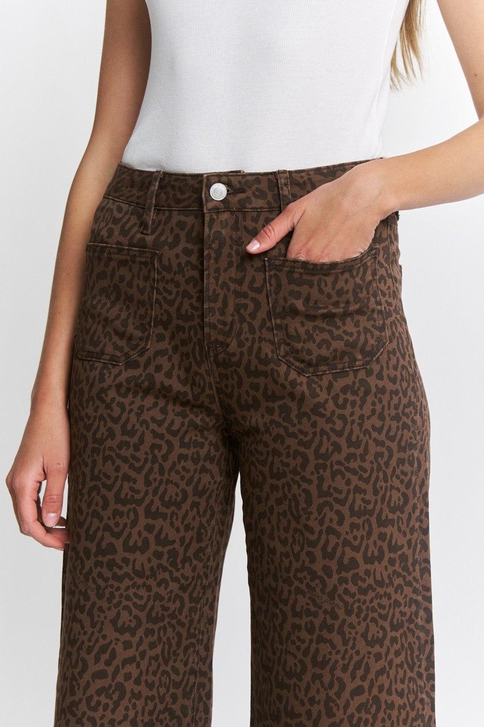 Step out with confidence in these playful Leopard Patch Pocket Jeans. Featuring bold leopard print accents and convenient patch pockets, their wide-leg cropped fit brings a trendy, carefree vibe perfect for making a statement. Ideal for adding a fun edge to any casual outfit, these jeans combine comfort and style with a fashion-forward twist.